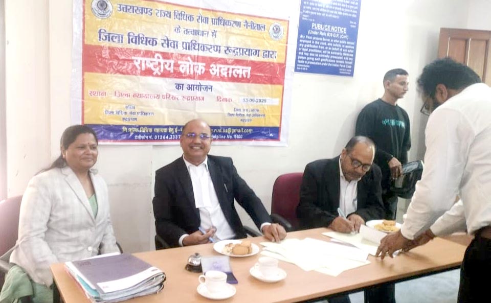 रुद्रप्रयाग, 13 सितंबर। जिला विधिक सेवा प्राधिकरण, रूद्रप्रयाग के तत्वाधान में माननीय अध्यक्ष/जनपद न्यायाधीश, जिला विधिक सेवा प्राधिकरण रूद्रप्रयाग, श्री सहदेव सिंह की मागदर्शन में जनपद न्यायालय रूद्रप्रयाग एवं बाह्य न्यायालय उखीमठ में राष्ट्रीय लोक अदालत का आयोजन किया गया। सिविल जज (सी0डि0)/सचिव, जिला विधिक सेवा प्राधिकरण, रूद्रप्रयाग श्रीमती पायल सिंह, द्वारा बताया गया कि राष्ट्रीय लोक अदालत में बैंक वाद से सम्बन्धित प्री-लिटिगेशन के कुल 56 मामलों का आपसी सुलह समझौते के आधार पर निस्तारण कर कुल 35,02,125/- समझौता राशि वसूल की गई।अशोक कुमार, मुख्य न्यायिक मजिस्ट्रेट, रूद्रप्रयाग व रामकृष्ण नौटियाल सदस्य की पीठ संख्या 01 के द्वारा 100 वाद निस्तारण कर मुव0 29,85,564/- समझौता राशि वसूल की गयी। सिद्वार्थ कुमार, न्यायिक मजिस्ट्रेट, रूद्रप्रयाग व श्री कुँवर सिंह रावत सदस्य की पीठ संख्या 02 के द्वारा कुल 53 वादों का निस्तारण कर मुव0 23,00,293/- समझौता राशि वसूल की गयी। सन्तोश पच्छिमी,सिविल जज (जू.डि.)/न्यायिक मजिस्ट्रेट, बाह्य न्यायालय उखीमठ व श्री बीरेन्द्र दत्त गोस्वामी सदस्य की पीठ संख्या 03 के द्वारा कुल 21 वादों का निस्तारण किया गया। जिसमें कुल मुव0 3,65,500/- समझौता राशि वसूल की गयी। इसके अतिरिक्त उक्त राष्ट्रीय लोक अदालत के सफल संचालन में पुलिस उपाधीक्षक रूद्रप्रयाग प्रमोद घिण्डियाल, परिवहन विभाग रूद्रप्रयाग सम्भागीय परिवहन रुद्रप्रयाग धर्मेन्द्र बिष्ट,समस्त अधिवक्तागणों एवं कर्मचारियों द्वारा सहयोग प्रदान किया गया।