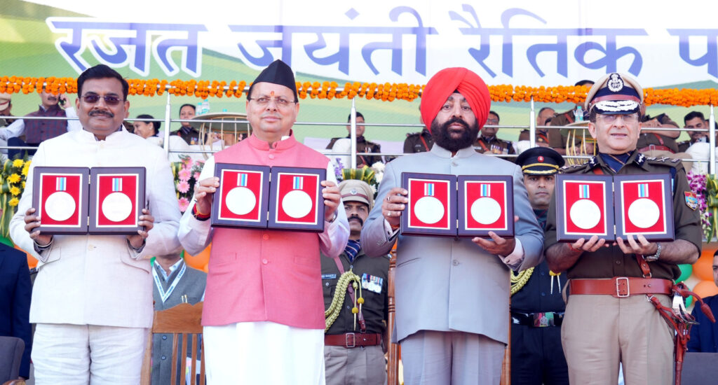 देहरादून, 07 नवंबर।उत्तराखण्ड राज्य स्थापना के रजत जयंती समारोह के अवसर पर गुरुवार को पुलिस लाइन, देहरादून में आयोजित कार्यक्रम में राज्यपाल लेफ्टिनेंट जनरल गुरमीत सिंह (से नि) एवं मुख्यमंत्री श्री पुष्कर सिंह धामी ने प्रतिभाग किया। राज्यपाल ने इस अवसर पर आयोजित रैतिक परेड का निरीक्षण कर सलामी ली। राष्ट्रीय गीत ‘‘वंदे मातरम’’ के 150 वर्ष पूर्ण होने के अवसर पर कार्यक्रम की शुरुआत वंदे मातरम गीत से हुई। इस अवसर पर राज्यपाल एवं मुख्यमंत्री द्वारा ‘‘उत्तराखण्ड पुलिस पत्रिका-2025’’ का विमोचन एवं रजत जयंती पदक के प्रतीकात्मक चिन्ह का अनावरण किया गया।