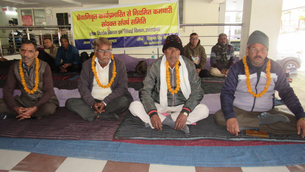 देहरादून, 29 नवंबर। लोक निर्माण विभाग एवं सिंचाई विभाग के सेवानिवृत्त कर्मचारी विगत 58 दिनों से अपनी पेंशन और स्वास्थ्य सुविधाओं की बहाली की मांग को लेकर यमुना कॉलोनी स्थित लोक निर्माण भवन मे धरने व 48 दिन से क्रमिक अनशन करते हुये आंदोलनरत हैं। आज क्रमिक अनशन पर बचन सिंह मनवाल, उदय सिंह नेगी, अनिल कुमार व अब्दुल कयूम बैठे।