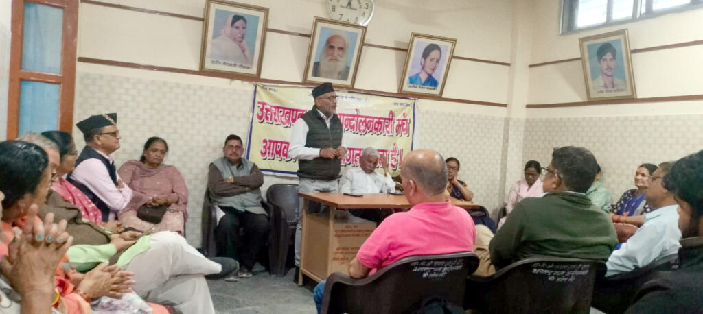 बैठक की अध्यक्षता केशव उनियाल ने की तथा संचालन पूर्ण सिँह लिंगवाल ने किया। बैठक मे उपस्तिथ एवं प्रमुख रूप से सम्बोधित करने वालों मे मंच क़े प्रदेश अध्यक्ष जगमोहन सिंह नेगी, प्रदेश महासचिव राम लाल खंडूरी, केशव उनियाल, पुष्पलता सिलमाना, द्वारिका बिष्ट, गुरदीप कौर, मोहन सिँह खत्री, राजेश्वरी परमार, मनोज नौटियाल, पूर्व पार्षद गणेश डंगवाल, पूर्ण सिँह लिंगवाल, चंद्र किरण राणा, बलबीर सिँह रावत, विनोद असवाल, प्रभात डंडरियाल, संगीता रावत, वीर सिँह रावत, सुधीर नारायण शर्मा, नरेन्द्र नौटियाल, अभिषेक रावत, राजेंद्र सिंह, राजेश्वरी रावत, लक्ष्मी बिष्ट, रेवती बिष्ट, मालती भट्ट, गीता नेगी, सुशील चमोली, सुरेश नेगी, मोहन थापा, सुलोचना गुसाई, सुखदेव सिँह, अवंतिका बिष्ट, अंजलि रावत, प्रियंका, आदि बड़ी संख्या मे आंदोलनकारी उपस्तिथ थे।