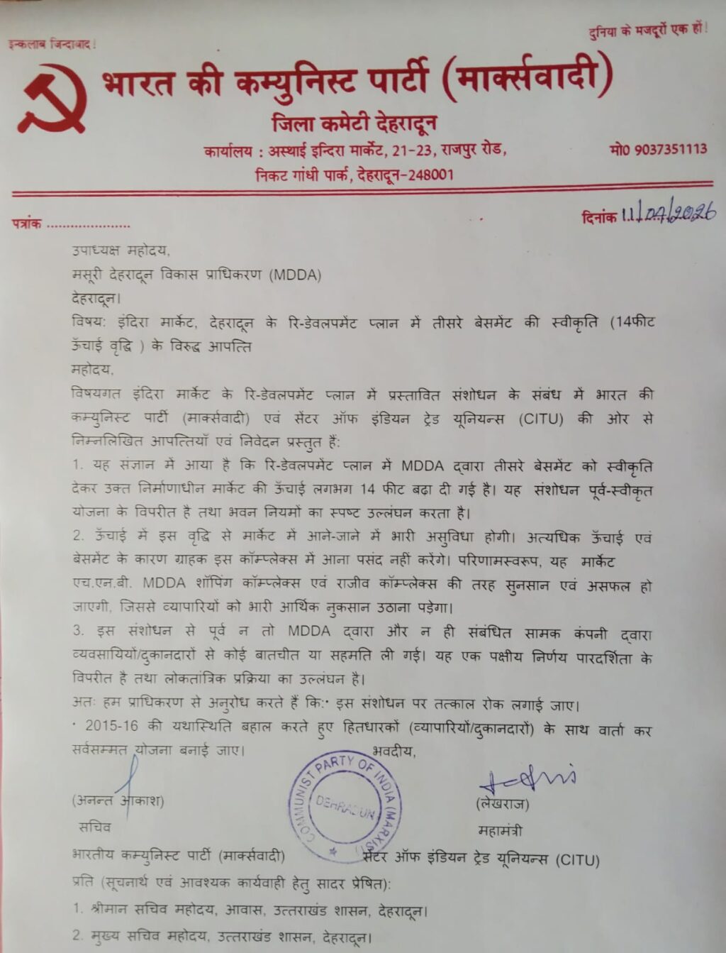 अनन्त आकाश सचिव भारत की कम्युनिस्ट पार्टी (मार्क्सवादी) व लेखराज, महामंत्री सेंटर ऑफ इंडियन ट्रेड यूनियन्स ने कहा कि आज इन्दिरा मार्केट रि- डैवलपमेंट प्लान के सन्दर्भ में सीपीएम व सीआईटीयू ने मुख्यमंत्री, मुख्यसचिव, आवास सचिव व महाप्रबन्धक सामाग को ज्ञापन प्रेषित किया। इंदिरा मार्केट के रि-डेवलपमेंट प्लान में प्रस्तावित संशोधन के सम्बन्ध में भारत की कम्युनिस्ट पार्टी (मार्क्सवादी) एवं सेंटर ऑफ इंडियन ट्रेड यूनियन्स की ओर से आपत्तियाँ दर्ज की गई हैं। रि-डेवलपमेंट प्लान में एमडीडीए द्वारा तीसरे बेसमेंट को स्वीकृति देकर उक्त निर्माणाधीन मार्केट की ऊँचाई लगभग 14 फीट बढ़ा दी गई है। यह संशोधन पूर्व -स्वीकृत योजना के विपरीत है तथा भवन नियमों का स्पष्ट उल्लंघन करता है।